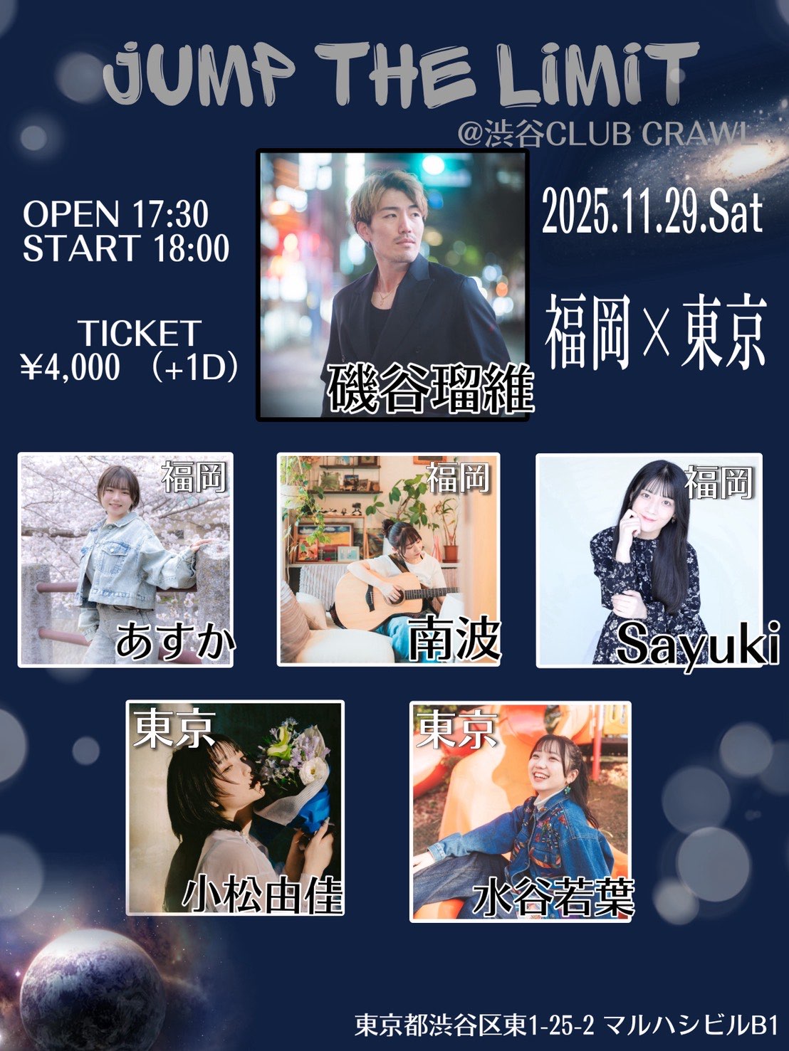 2025.11.29 JUMP THE LiMiT live 2025.11.29SAT OPEN 17:30 / START 18:00 JUMP THE LiMiT 磯谷瑠維/あすか/南波/Sayuki/小松由佳/水谷若葉 Adv ¥4,000Drink ¥600 / 1 order※会場付近たむろ禁止 ※再入場禁止 ※飲食物持ち込み厳禁 Post navigation ← IVY’s DIARY vol.20〜メリークリスマス〜 CLUB CRAWL pre. 「Crawls」 asano raincoat『midnight motion』 mini album Release “Dancing in Pastels ” モーション止められナイトツアー2025 →