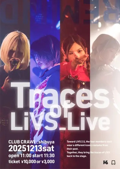 2025.12.13 Traces of LiVS_ Live live 2025.12.13SAT OPEN 11:00 / START 11:30 Traces of LiVS_ Live LiVS 最高チケット¥10,000/人間チケット¥3,000 Drink ¥600 / 1 orderプレイガイドhttps://ticketdive.com/event/traces_livs ※会場付近たむろ禁止 ※再入場禁止 ※飲食物持ち込み厳禁 Post navigation ← AND CaaaLL 1周年感謝祭 PANDAMIC ANNIVERSARY CAMPAIGN「PANDARA’S BOX -point-」 →