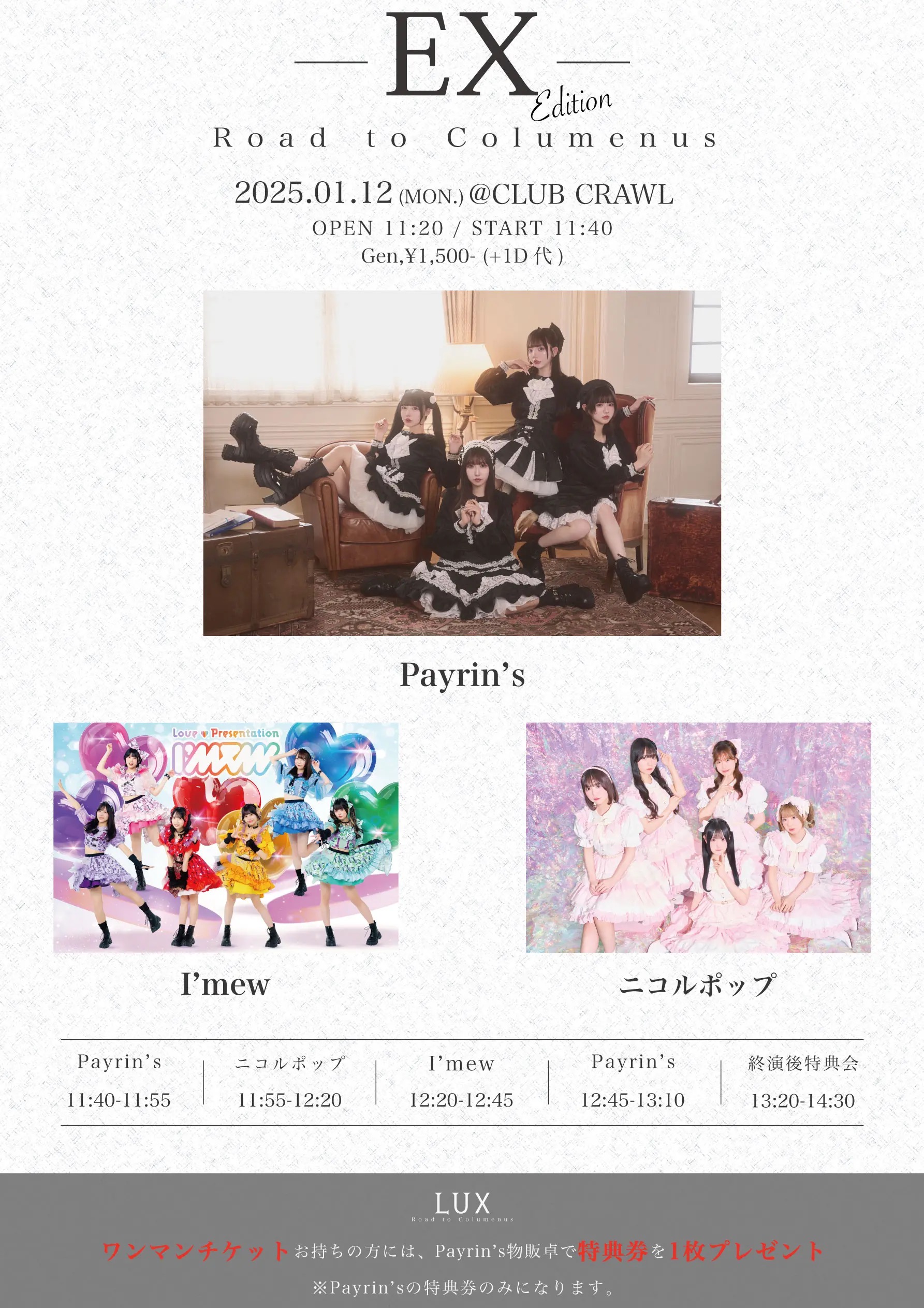 2026.01.12 Payrin’s Road to Colmenus『- EX -』 live 2026.1.12MON OPEN 11:20 / START 11:40 Payrin’s Road to Colmenus『- EX -』 Payrin’s/ニコルポップ/I’mew(あいみゅう) Gen,¥1,500- (+1D代) Drink ¥600 / 1 orderプレイガイドhttps://livepocket.jp/e/rtc-ex- ※会場付近たむろ禁止 ※再入場禁止 ※飲食物持ち込み厳禁 Post navigation ← CRAWL 2026年新春弾き語り大会! CLUB CRAWL pre. “Crawls” →