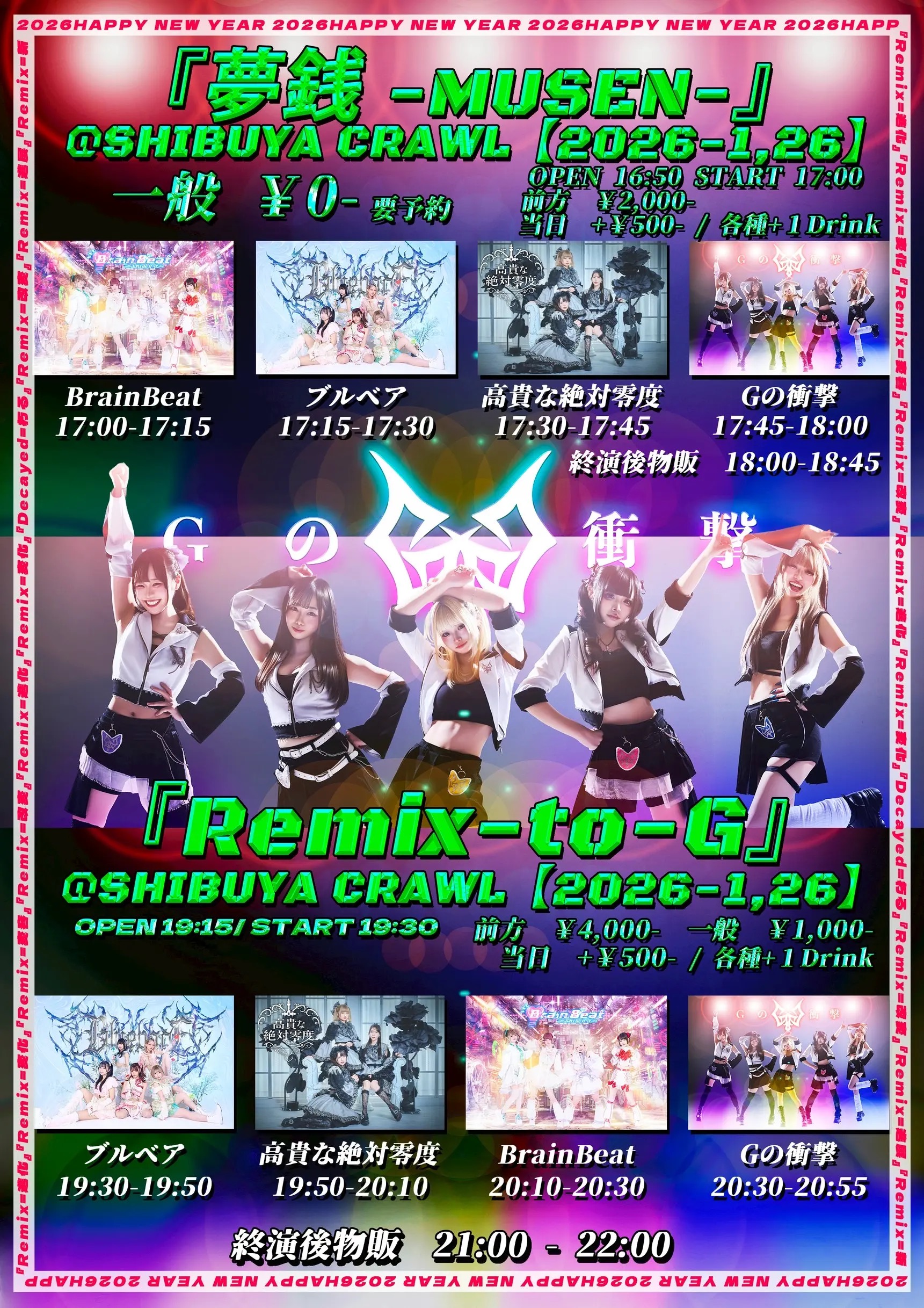 2026.01.26 『夢銭』 live 2026.1.26MON OPEN 16:50 / START 17:00 『夢銭』 Gの衝撃/BrainBeat/ブルベア/高貴な絶対零度 前方¥2,000/一般¥0(予約必須)/当日+¥500(各D代別) Drink ¥600 / 1 orderプレイガイドhttps://livepocket.jp/e/18l6u ※会場付近たむろ禁止 ※再入場禁止 ※飲食物持ち込み厳禁 Post navigation ← プラチナム歌合戦 vol.2 『Remix-to-G』 →