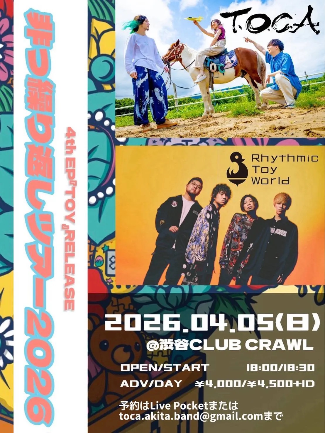 2026.04.5 T.O.C.A 4th EP「TOY」RELEASE 非っ繰り返しツアー2026 live 2026.4.5SUN OPEN 18:00 / START 18:30 T.O.C.A 4th EP「TOY」RELEASE 非っ繰り返しツアー2026 T.O.C.A/Rhythmic Toy World Drink ¥600 / 1 orderプレイガイドhttps://livepocket.jp/e/s8v01 ※会場付近たむろ禁止 ※再入場禁止 ※飲食物持ち込み厳禁 Post navigation ← 最後の夏休みpresents『After Music Live』 闇雲×憑依中毒-シャーマンホリック- 2MAN LIVE『狂同戦線』 →