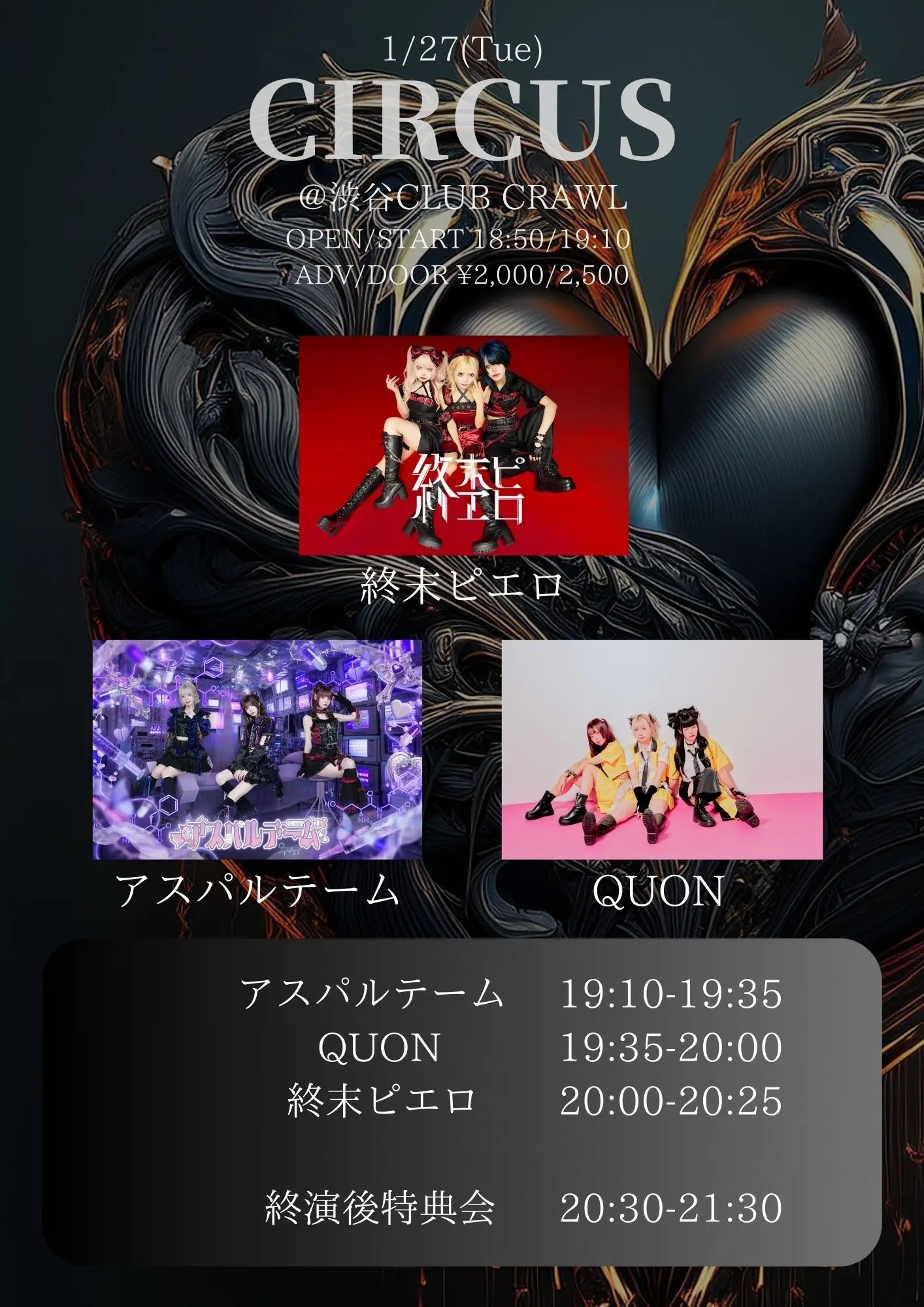 2026.01.27 CIRCUS live 2026.1.27TUE OPEN 18:50 / START 19:10 CIRCUS 終末ピエロ/アスパルテーム/QUON Adv ¥2,000Door ¥2,500Drink ¥600 / 1 orderプレイガイドhttps://livepocket.jp/e/8yhfg ※会場付近たむろ禁止 ※再入場禁止 ※飲食物持ち込み厳禁 Post navigation ← 【CIRCUS】