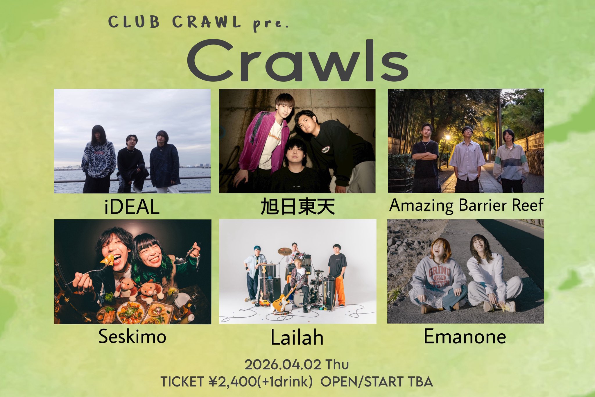 2026.04.2 CLUB CRAWLpre. Crawls live 2026.4.2THU OPEN / START CLUB CRAWLpre. Crawls iDEAL/旭日東天/Emanone/Amazing Barrier Reef/Seskimo/Lailah Adv ¥2,400Door ¥2,400Drink ¥600 / 1 order※会場付近たむろ禁止 ※再入場禁止 ※飲食物持ち込み厳禁 Post navigation ← 『単独公演第4弾』 〜新曲お披露目公演〜 「CLUB CRAWL」×「名古屋HeartLand」pre. 「不易流行」 →