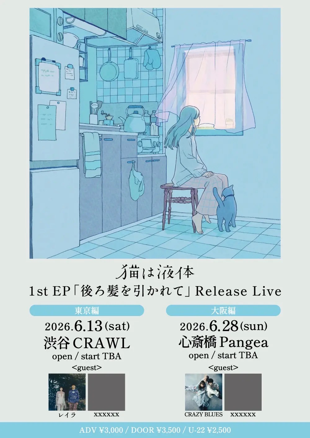2026.06.13 猫は液体 1st EP「後ろ髪を引かれて」Release Live live 2026.6.13SAT OPEN / START 猫は液体 1st EP「後ろ髪を引かれて」Release Live 猫は液体/レイラ/and more… U-22¥2,500 Adv ¥3,000Door ¥3,500Drink ¥600 / 1 orderプレイガイドhttps://livepocket.jp/e/xi153 ※会場付近たむろ禁止 ※再入場禁止 ※飲食物持ち込み厳禁 Post navigation ← AND CaaaLL定期公演 『CaaaLL Over vol.3』