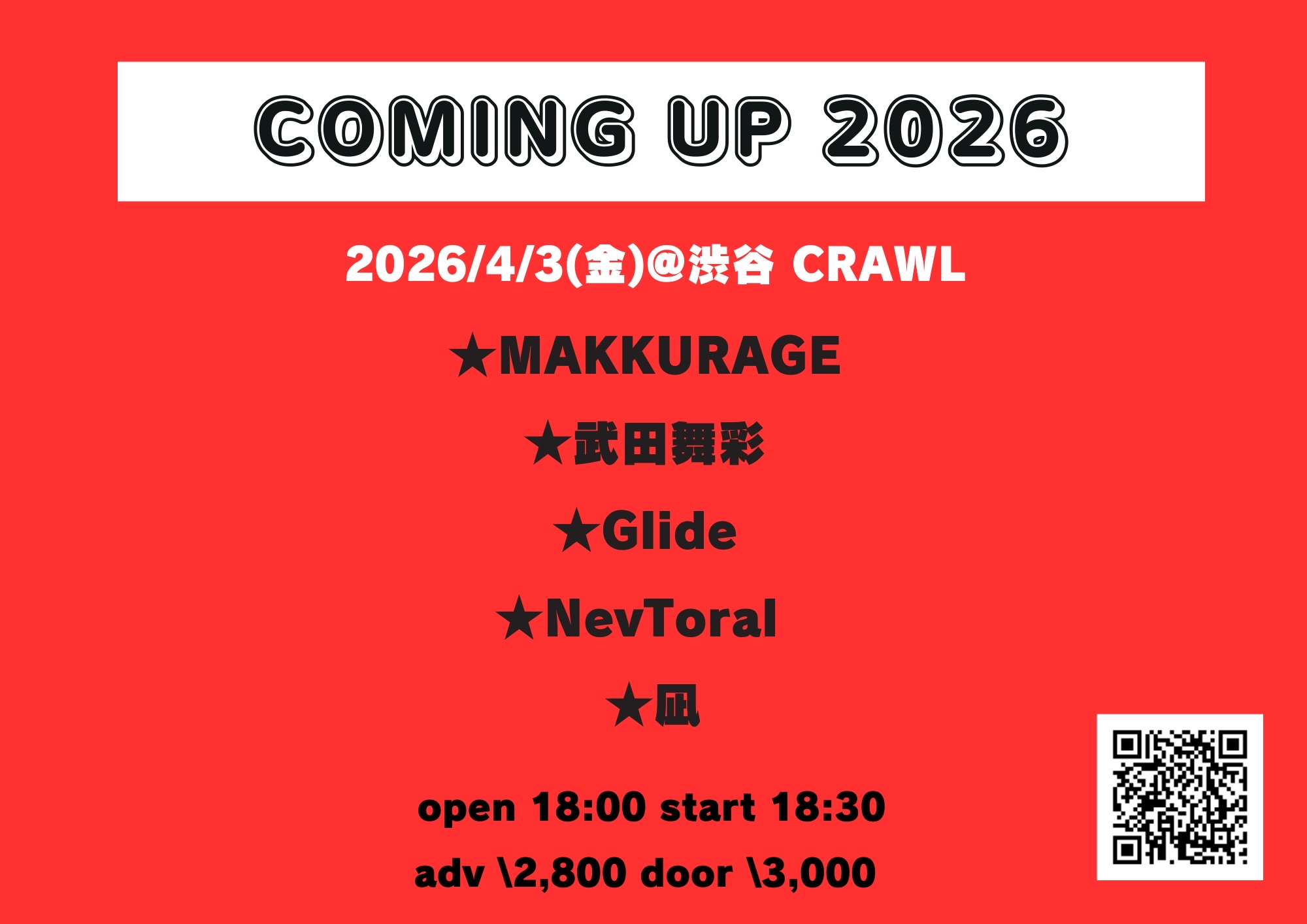 2026.04.3 「COMING UP 2026」 live 2026.4.3FRI OPEN 18:00 / START 18:30 「COMING UP 2026」 MAKKURAGE/武田舞彩/Glide/NevToral/凪 Adv ¥2,800Door ¥3,000Drink ¥600 / 1 orderプレイガイドhttps://livepocket.jp/e/p8pq1 ※会場付近たむろ禁止 ※再入場禁止 ※飲食物持ち込み厳禁 Post navigation ← 渋谷CLUB CRAWL 響宴〜From HOME〜 DIJ presents 〜北の襲来〜 →