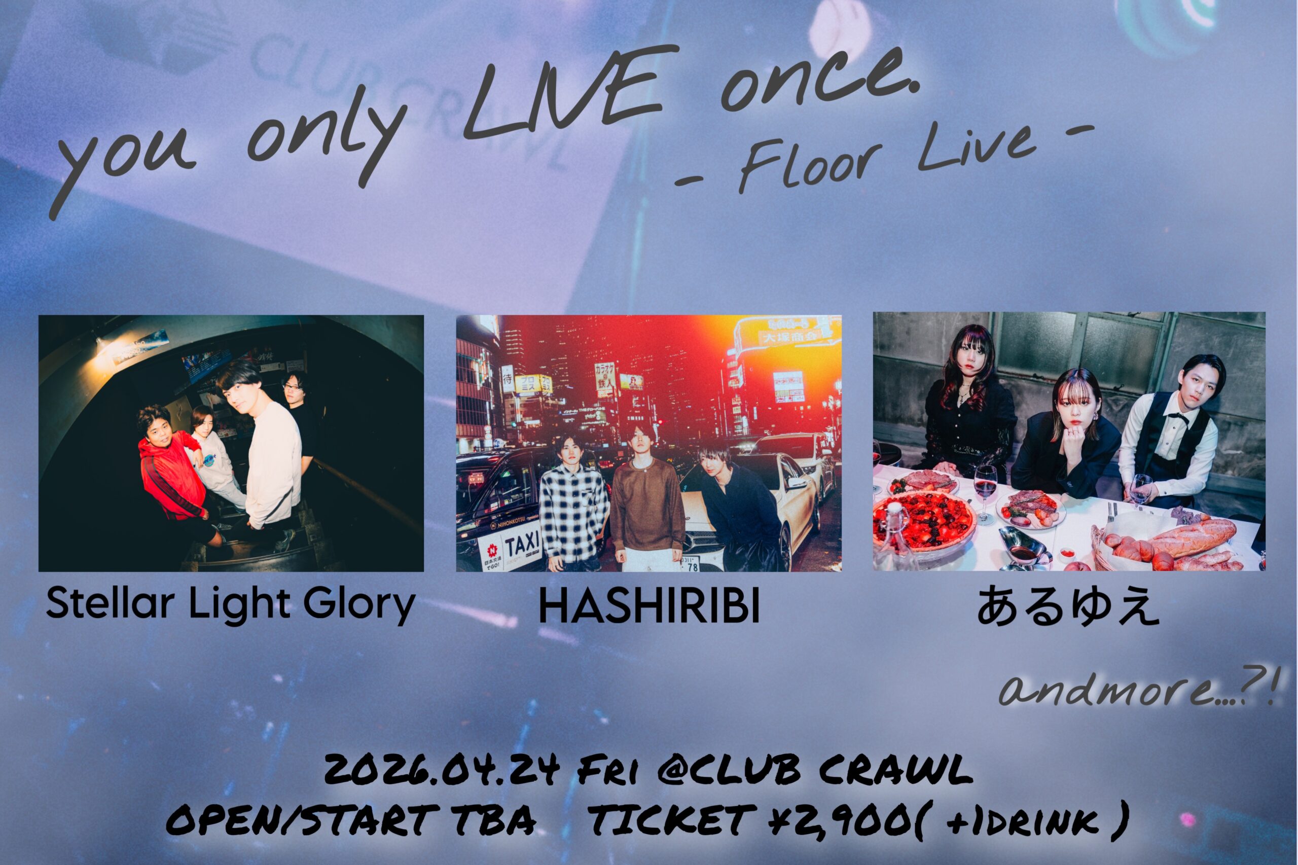 2026.04.24 you only LIVE once. ーフロアライブ編ー live 2026.4.24FRI OPEN / START you only LIVE once. ーフロアライブ編ー Stellar Light Glory/HASHIRIBI/あるゆえ/and more… Adv ¥2,900Drink ¥600 / 1 order※会場付近たむろ禁止 ※再入場禁止 ※飲食物持ち込み厳禁 Post navigation ← ばんじーがむとなかよくしてください!ツーマン編 GIG HOLIC →