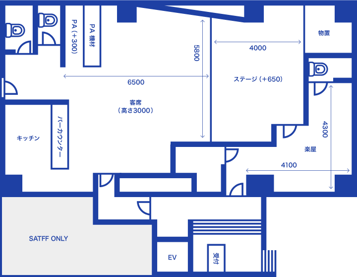 ステージ高 650 / ステージから天井 2000~2300 /ステージ開口部 5000