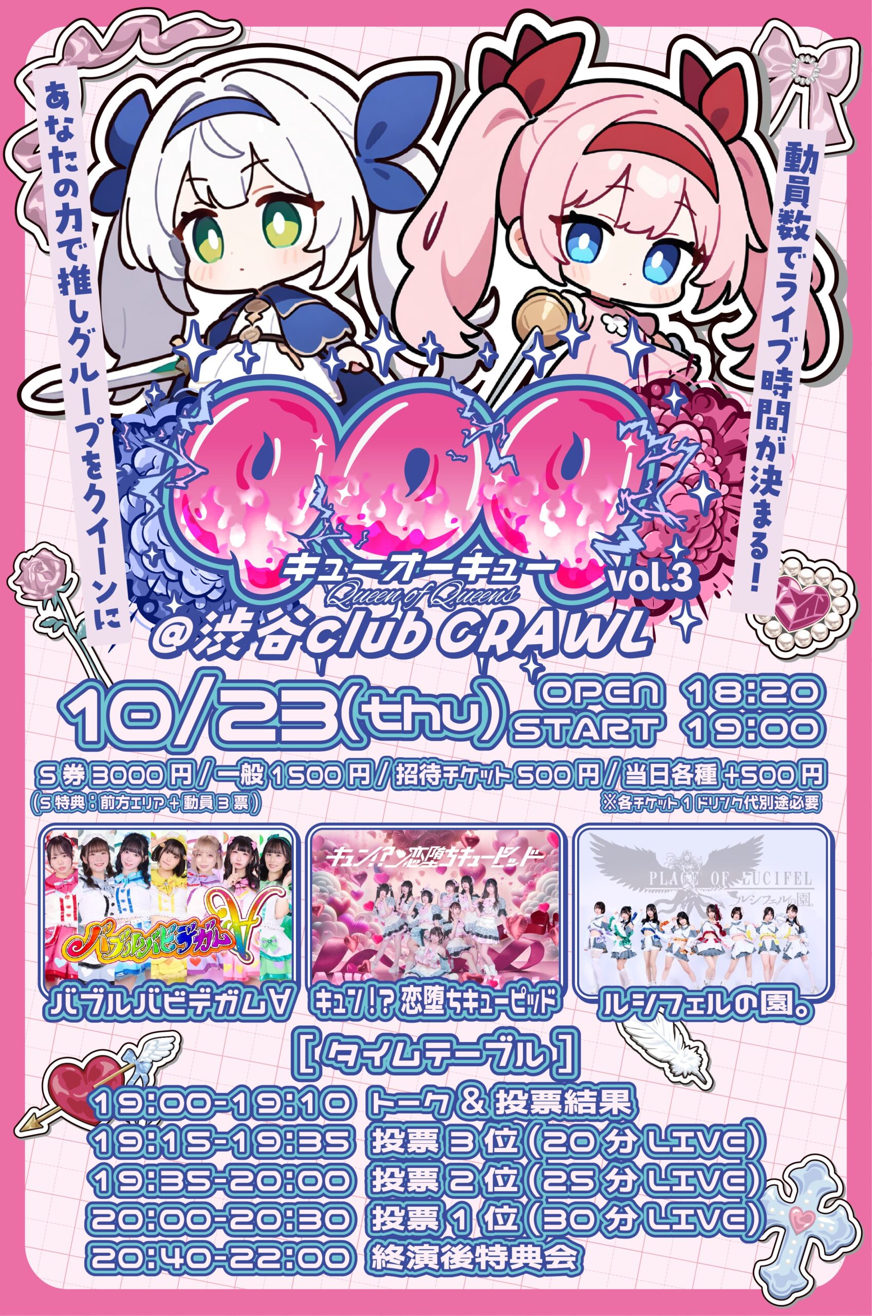 S券¥3000(前方エリア+動員3票)/一般¥1500/招待チケット¥500(手売りのみ)/当日各+¥500(各1D代別)